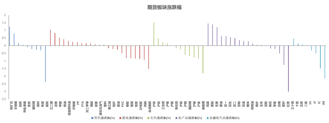 从板块整体表现看,农产品、国债多数上涨,黑色、有色多数下跌。