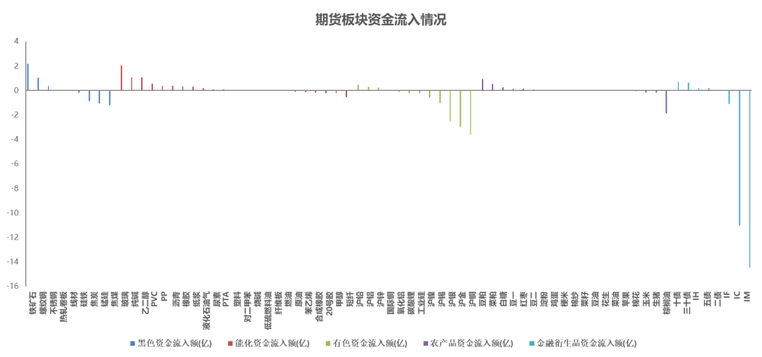 资金流入前三名为铁矿石、玻璃和纯碱;流出前三名分别为IM、IC和沪铜。