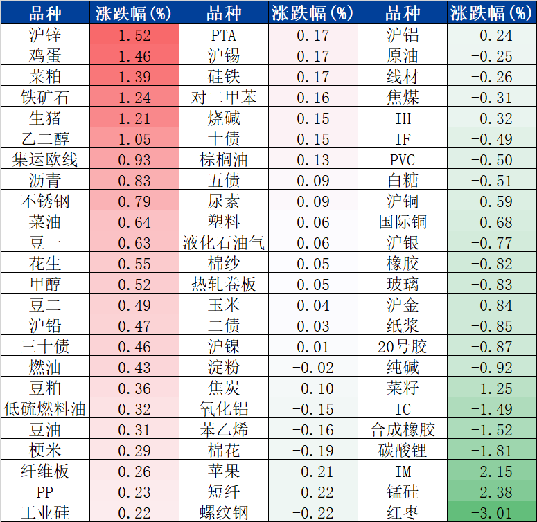涨幅居前的三个品种分别是沪锌、鸡蛋和菜粕;跌幅居前的是红枣、锰硅和IM。