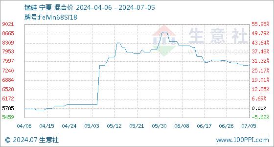 7月5日,生意社锰硅基准价为7450.00元/吨,与本月初(7550.00元/吨)相比,下降了-1.32%。