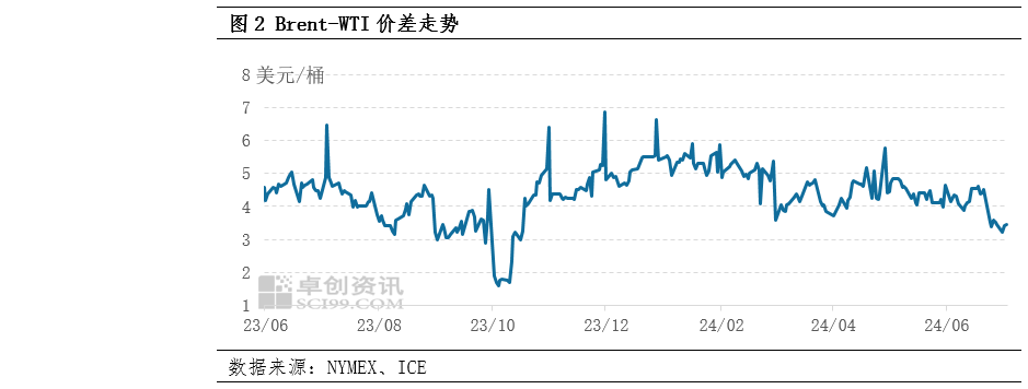 6月以来WTI非商业多头持仓增幅显著,从6月11日当周到6月25日当周增加了42916手,增幅13.5%,非商业净多头增幅达到16.2%,多空比也上涨至4.02。但布伦特净持仓和WTI走势出现明显分化,6月4日当周布伦特期货净多头跌至2014年10月以来最低水平,尽管之后有所回升,但总量水平不及WTI。从价差上也可以看到,截至6月末,Brent-WTI价差走弱至3.4附近,接近我们测算的均值区间下限。