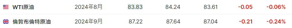3.截至发稿,WTI原油跌0.06%,报83.83美元/桶。布伦特原油跌0.24%,报87.22美元/桶。
