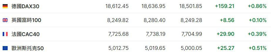 2.截至发稿,德国DAX指数涨0.86%,英国富时100指数涨0.10%,法国CAC40指数涨0.39%,欧洲斯托克50指数涨0.51%。
