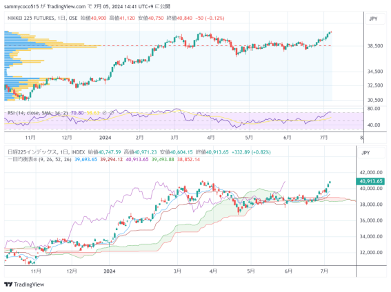 昨天的东京证券市场,在良好的风险资产偏好的支撑下,日经平均指数连续大幅上涨超过300日元,一度超过今年3月份高点后来到40900日元一线水收盘。前一天的欧洲股市全线走高,吸引了对于高科技股的买盘。受此影响,东京市场早盘在风险资产偏好的推动下,日经平均指数来到40900日元以上水平,打破了今年3月创下的历史高点。另外,东证指数也在时隔34年零7个月后再次创下历史最高点。最后各指数纷纷在日内最高附近收盘。进入欧美交易时间, 在美国节假日休市以及周末美国就业报告公布前的普遍观望氛围中,股指期货市场维持在日盘的高价位小幅波动。经指数期货晚盘维持40900日元一线收盘。