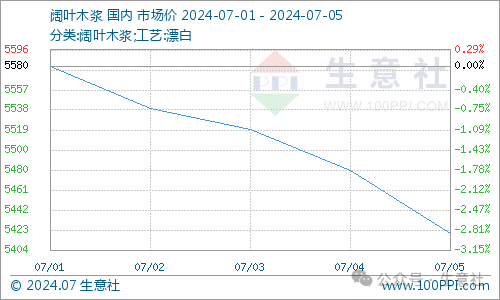 近期木浆行情持续下跌。当前市场恰逢淡季且需求清淡,部分纸企开工或继续下探以缓解库存压力,终端需求颓势未见明显好转,对上游浆价支撑力度较差。且新增装置的利空还未完全消化,市场弱势心态持续,预计短期木浆现货价格低位震荡。