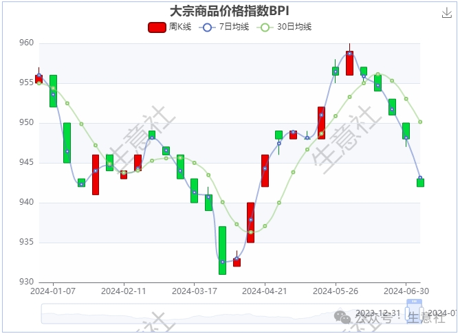7月5日大宗商品价格指数BPI为942点,较周初下降了1点,较周期内最高点1343点(2021-10-19)下降了29.86%,较年内最低点931点(2024-03-31)上涨了1.18%。