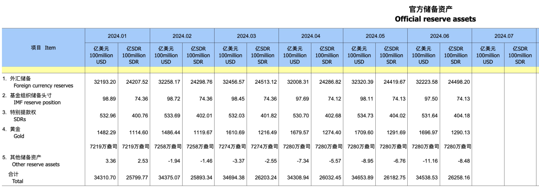 央行官网7月7日更新数据显示,截至2024年6月末,我国央行黄金储备报7280万盎司,与5月末持平。
