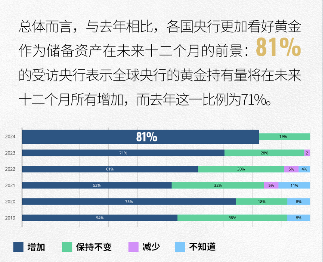 世界黄金协会近期发布的《2024年央行黄金储备调查》显示,在今年2月19日至4月30日接受调查的70家全球央行中,81%的受访央行表示全球央行的黄金持有量将在未来十二个月有所增加,这一比例达到2019年该项调查开展以来的最高水平。
