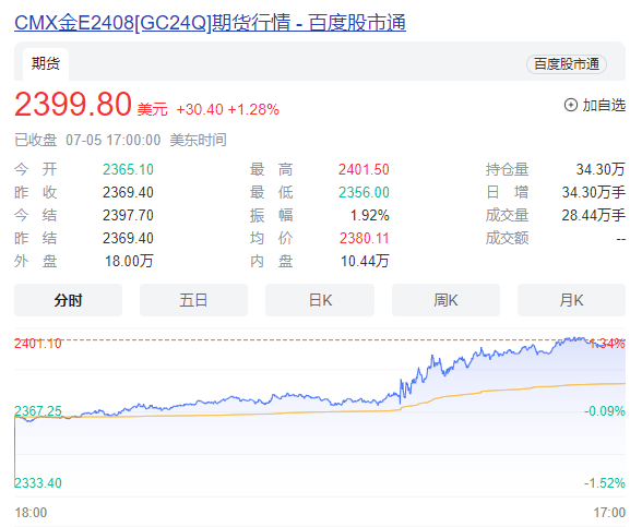 当地时间7月5日收盘,COMEX黄金期价上涨1.28%,报2399.8美元/盎司,再度逼近2400美元关口,升至一个月以来新高。伦敦金现收涨1.44%,报2390.85美元/盎司。此外,白银表现更为活跃,COMEX白银期价涨2.66%,报31.36美元/盎司。