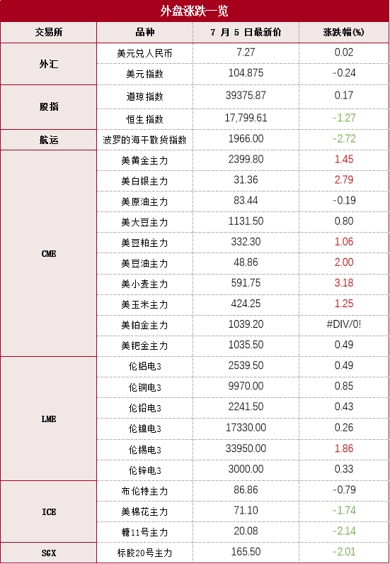 隔夜,LME铜收涨84美元,涨幅0.85%,LME铝收涨12美元,涨幅0.49%,LME锌收涨10美元,涨幅0.33%,LME镍收涨45美元,涨幅0.26%,LME锡收涨620美元,涨幅1.86%,LME铅收涨9美元,涨幅0.43%。消息面:美国6月非农就业人数增加20.6万人,好于市场预测的19万人,但低于5月向下修正的21.8万人。欧元区6月CPI初值同比升2.5%,预期升2.5%。欧元区6月制造业PMI终值为45.8,预期45.6。本周山东省内所有铜炼厂均结束检修,开始投料生产。2023年底,铅精矿加工费已跌破2016年的历史低位1000元/金属吨,最新600元/吨。铜矿商自由港印尼的发言人周三表示,已获得今年剩余时间的铜精矿出口许可。据SMM调研了解,6月SMM电线电缆样本企业开工率为71.65%,环比增长3.75个百分点,同比减少12.85个百分点。最新全国主流地区铜库存增0.26万吨至40.98万吨,国内电解铝社会库存增0.43万吨至77.33万吨,铝棒库存减0.1万吨至13.97万吨,七地锌库存增0.04万吨至19.83万吨。金属库存小幅回落,欧洲率先降息,美联储按兵不动,美元震荡。操作建议,短线交易思路为主。观点仅供参考。