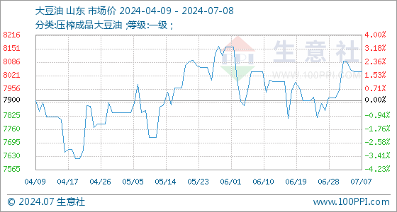 7月8日,生意社大豆油基准价为8040.00元/吨,与本月初(7912.00元/吨)相比,上涨了1.62%。