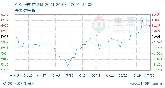 7月8日,生意社PTA基准价为6104.00元/吨,与本月初(6025.00元/吨)相比,上涨了1.31%。