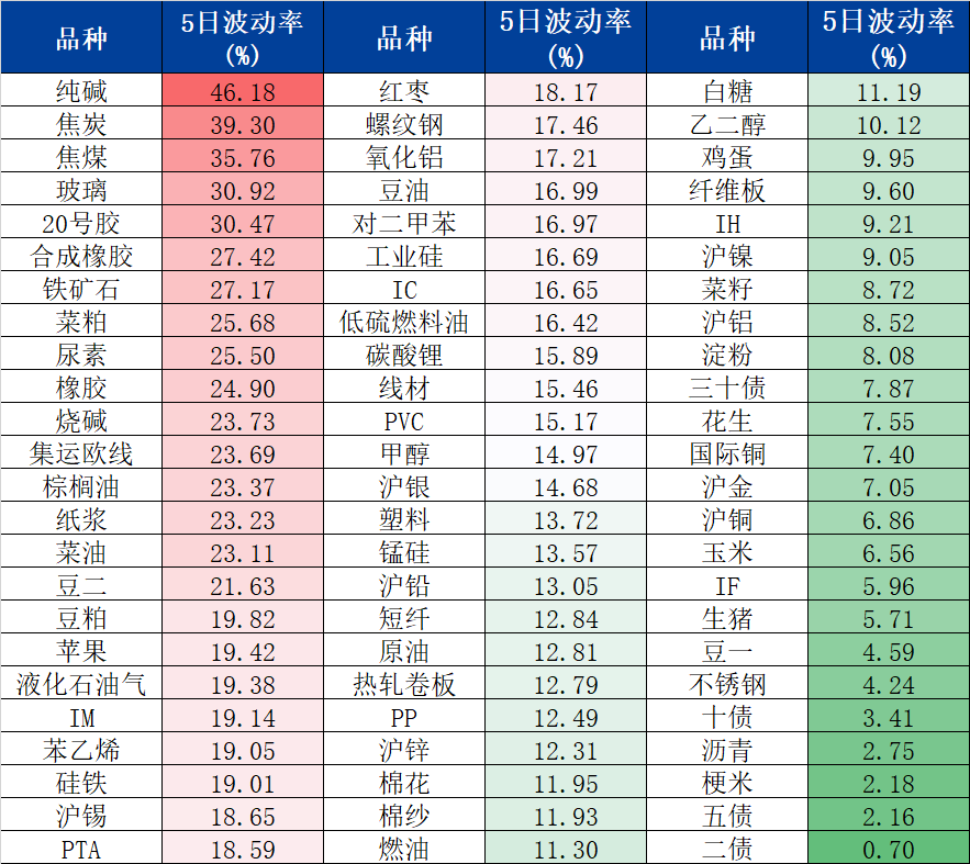 从5日波动率水平看,前三位为纯碱、焦炭和焦煤;低波动前三品种为二债、五债和梗米。