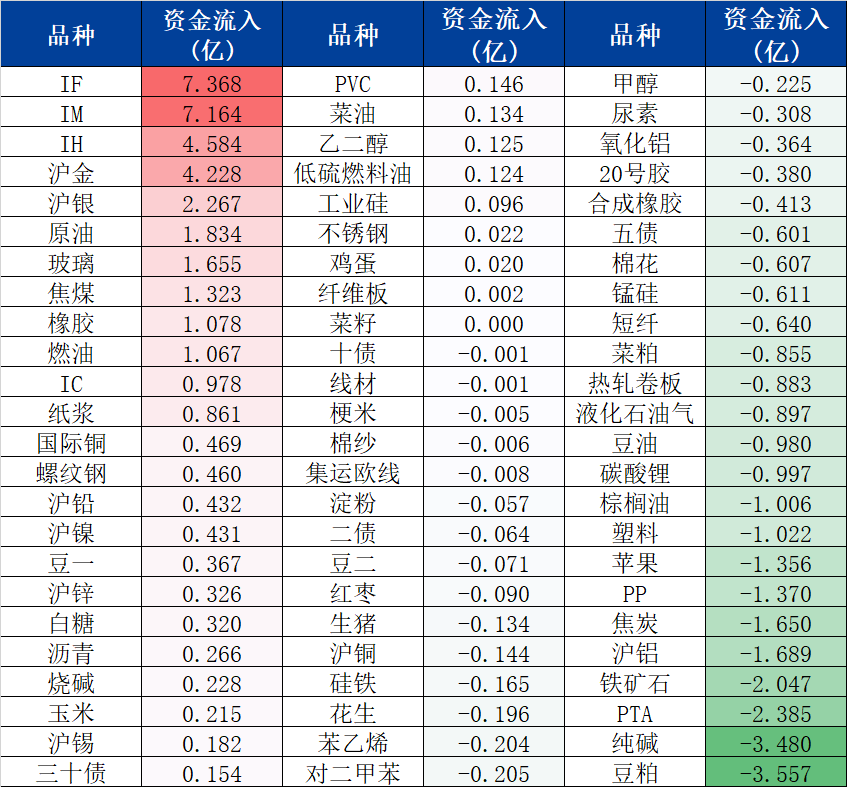 资金流入前三名为IF、IM和IH;流出前三名分别为豆粕、纯碱和PTA。