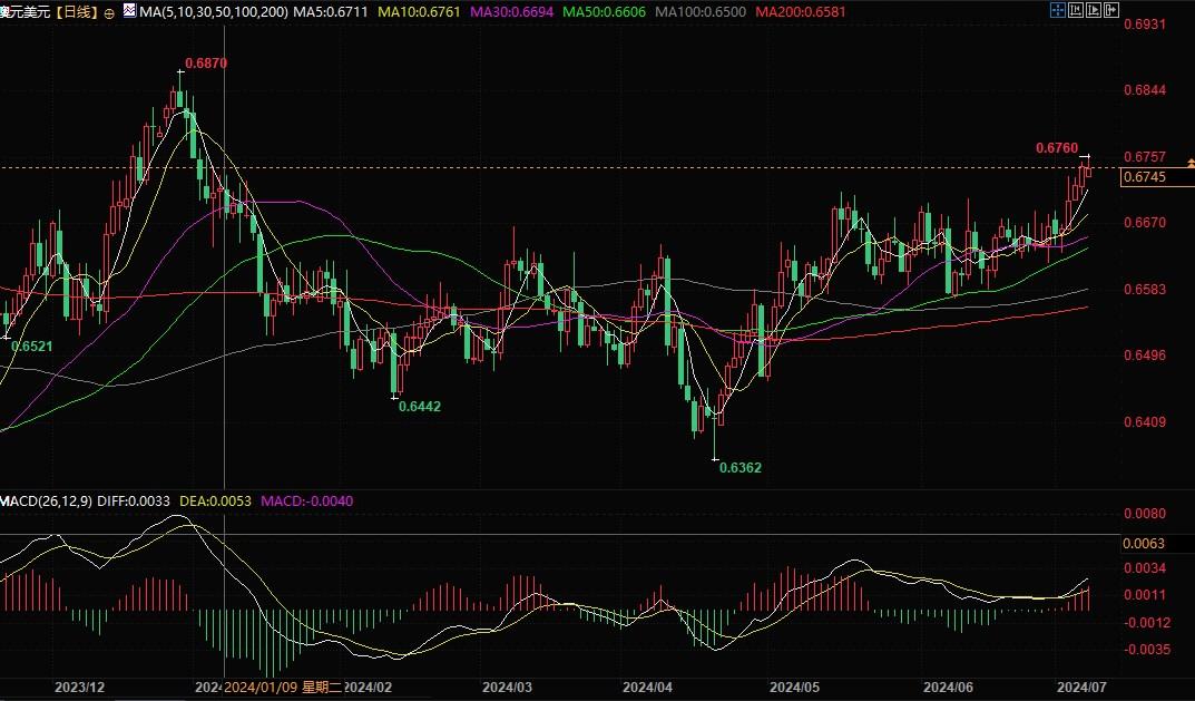 北京时间7月8日13:31,澳元兑美元报0.6746/47