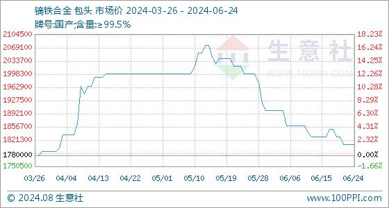 6月24日,生意社镝铁合金基准价为1810000.00元/吨,与本月初(1900000.00元/吨)相比,下降了-4.74%。