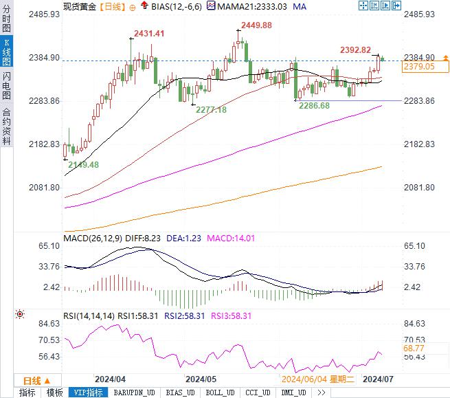 美元的强势反弹是导致黄金价格回调的重要因素之一。美元指数在7月8日一度突破105.00关口,目前稳定在104.8939附近。美元的走强通常对黄金构成压力,因为黄金以美元计价,美元升值意味着购买黄金的成本上升。