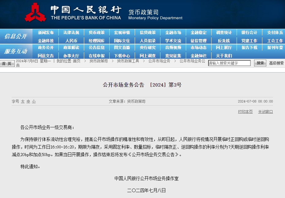 7月8日,央行网站消息。从即日起,人民银行将视情况开展临时正回购或临时逆回购操作,时间为工作日16:00—16:20,期限为隔夜,采用固定利率、数量招标,临时隔夜正、逆回购操作的利率分别为7天期逆回购操作利率减点20bp和加点50bp。如果当日开展操作,操作结束后将发布《公开市场业务交易公告》。
