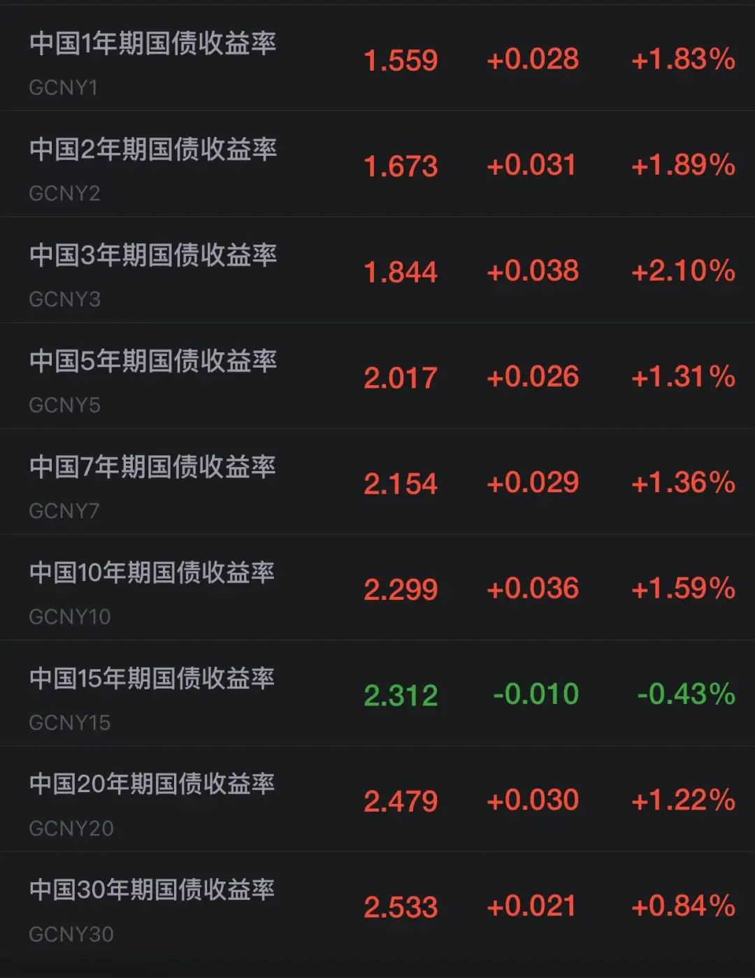 从债券市场今日反应来看,10年期和30年期国债收益率集体上涨,截止发稿,30年期国债收益率上涨0.84%,收益率触及2.533%,10年国债收益率上涨1.59%,收益率2.299%。