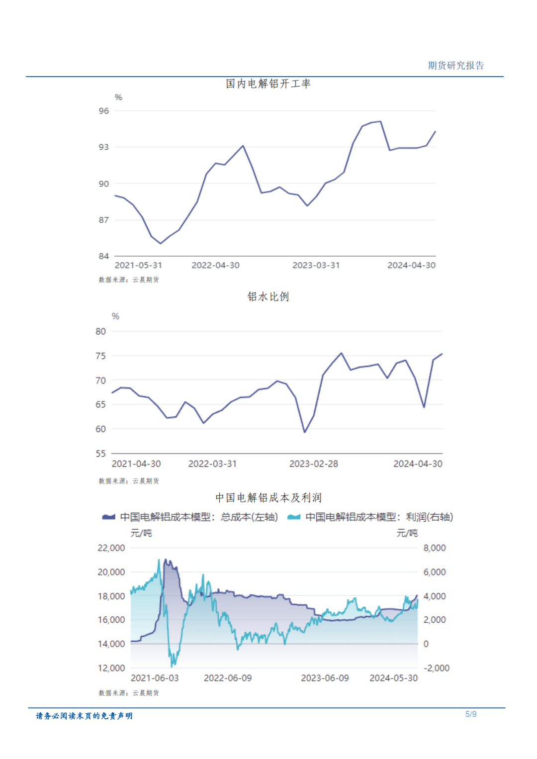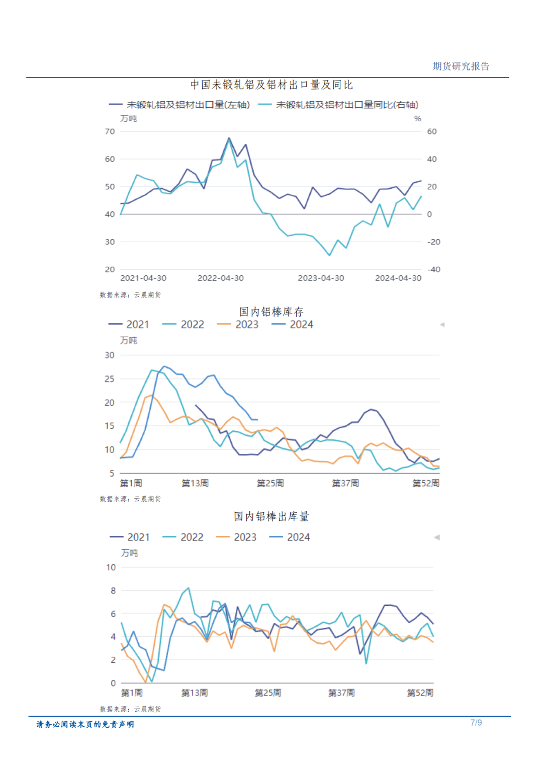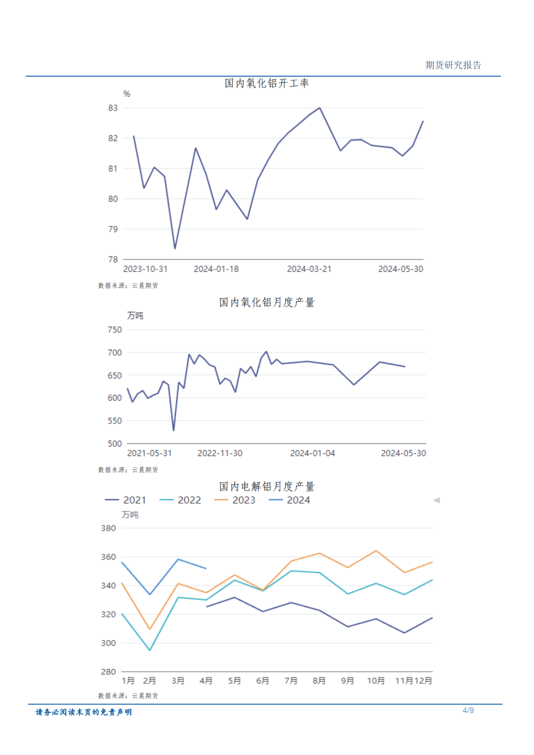 供应端,上周国内电解铝运行产能缓慢上升至4339万吨,云南、四川及贵州等地区仍有部分产能待复产,但大部分都已完成复产,后期运行产能上升空间有限,接近峰值。