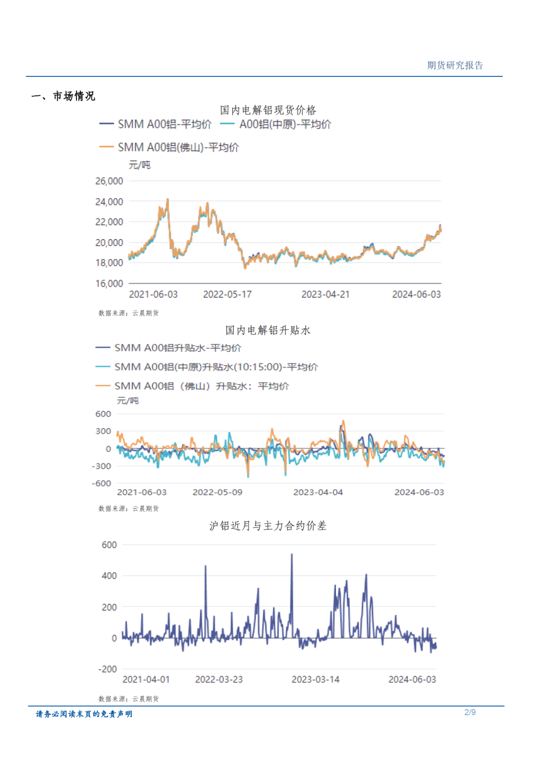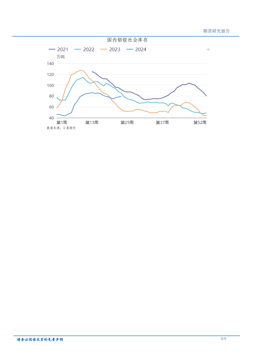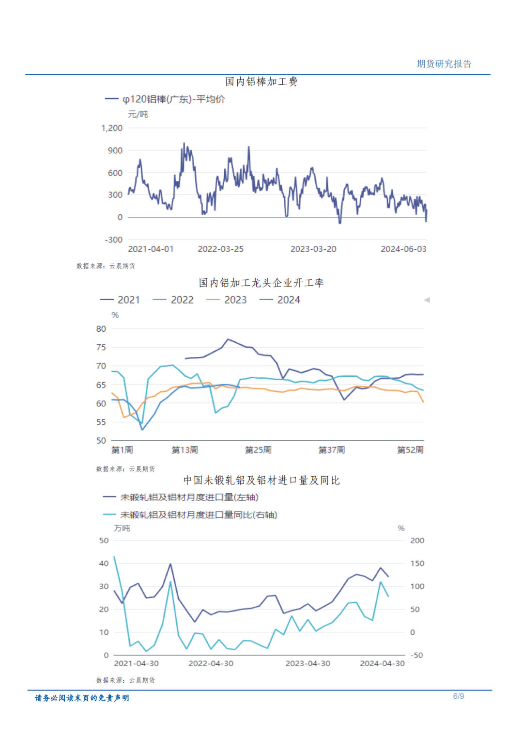 供应端,上周国内电解铝运行产能缓慢上升至4339万吨,云南、四川及贵州等地区仍有部分产能待复产,但大部分都已完成复产,后期运行产能上升空间有限,接近峰值。