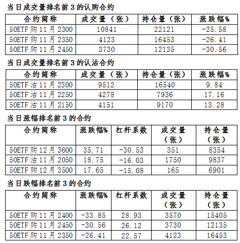上交所期权每日行情2015-11-0411月4日,上证50ETF现货报收于2.386元,上涨5.02%。上证50ETF期权总成交182975张, 较上一交易日增加136.67%,总持仓364890张,较上一交易日减少1.73%。认沽认购比为0.76(上一交易日认沽认购比0.87)。注:(1)涨跌幅=期权合约当日结算价/期权合约上一交易日结算价;(2)杠杆系数=期权合约价格涨...