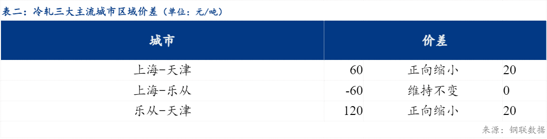 上海-天津价差为60元/吨,上海-乐从价差为60元/吨 ,乐从-天津价差为120元/吨。今日上海-天津价差日环比收窄20元/吨、上海-乐从价差日环比持平、乐从-天津价差日环比收窄20元/吨。