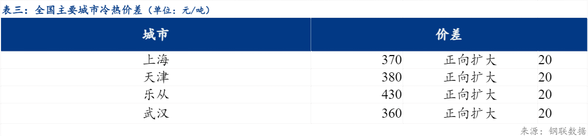 上海冷热价差为370元/吨,天津冷热价差为380元/吨,乐从冷热价差为430元/吨,武汉冷热价差为360元/吨。今日上海冷热价差日环比扩大20元/吨、天津冷热价差日环比扩大20元/吨、乐从冷热价差日环比扩大20元/吨、武汉冷热价差日环比扩大20元/吨。