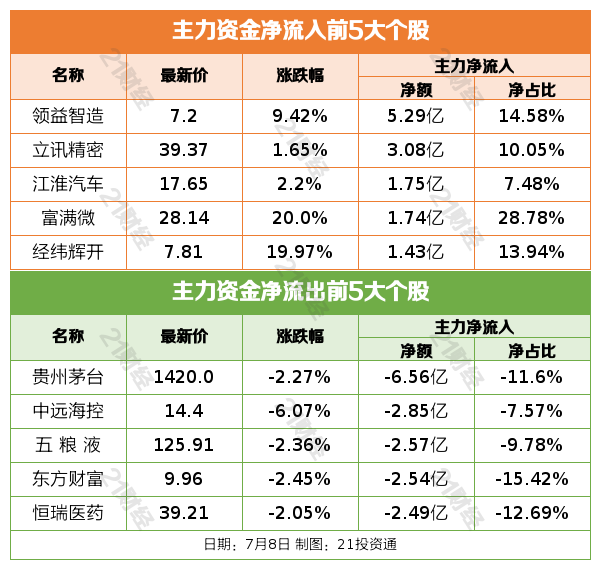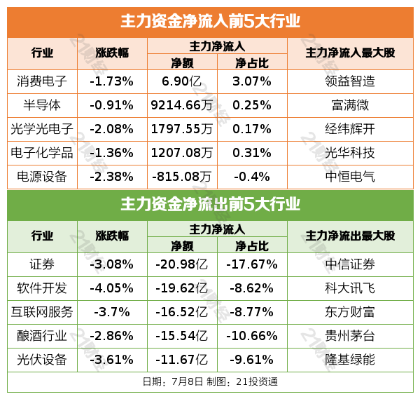 7月8日,市场全天低开低走,创业板指领跌。截至收盘,沪指跌0.93%,深成指跌1.54%,创业板指跌1.62%。总体上个股跌多涨少,全市场超4800只个股下跌。沪深两市成交额5820亿,较上个交易日放量72亿,连续4个交易日低于6000亿。板块方面,芬太尼、养鸡、银行等少数板块上涨,软件、多模态AI、车路云、手机游戏等板块跌幅居前。