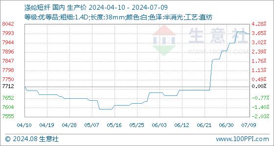 7月9日,生意社涤纶短纤基准价为7993.33元/吨,与本月初(7901.67元/吨)相比,上涨了1.16%。