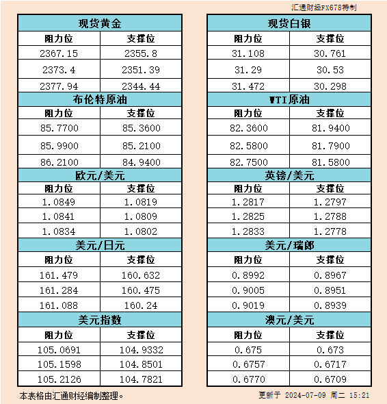 汇通财经APP讯——7月9日欧市黄金、白银、原油、美元指数、欧元、英镑、日元、瑞郎、澳元支撑阻力位一览。