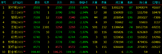 2024年7月9日,国内期货主力合约涨跌不一。集运欧线涨超2%,丁二烯橡胶、橡胶涨超1%。跌幅方面,菜粕跌超3%,豆二、锰硅、烧碱、豆粕跌超2%。
