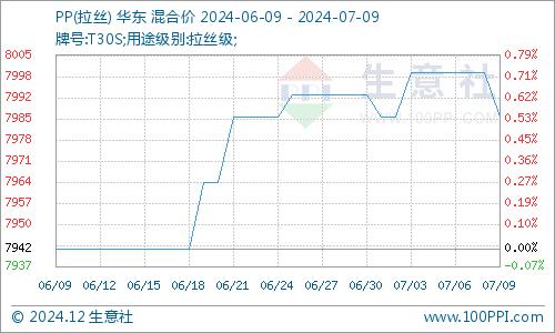 据生意社商品行情分析系统显示,7月上旬PP市场行窄幅震荡,各牌号产品价格大稳小动。截止7月9日下午,国内生产商、贸易商拉丝主流报盘价格在7985.71元/吨左右,与7月1日价格相比持平。