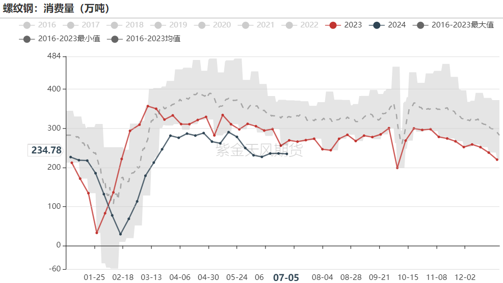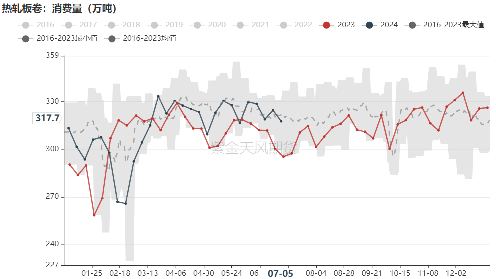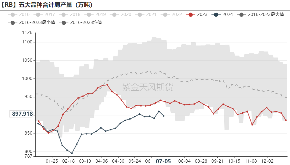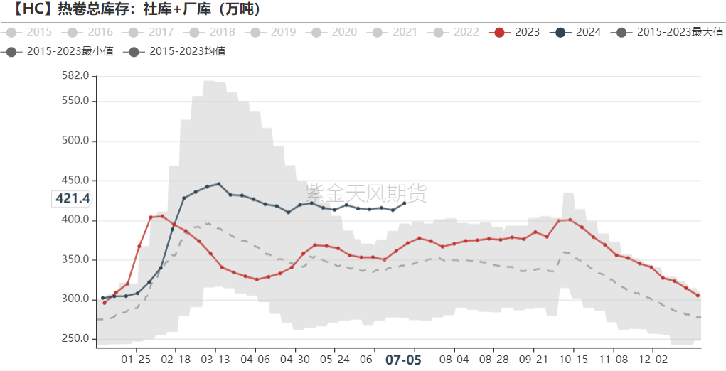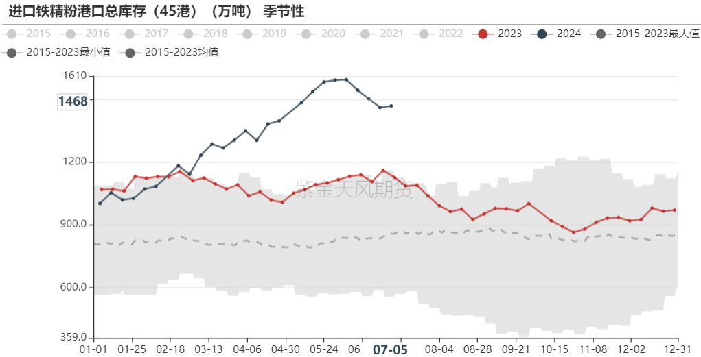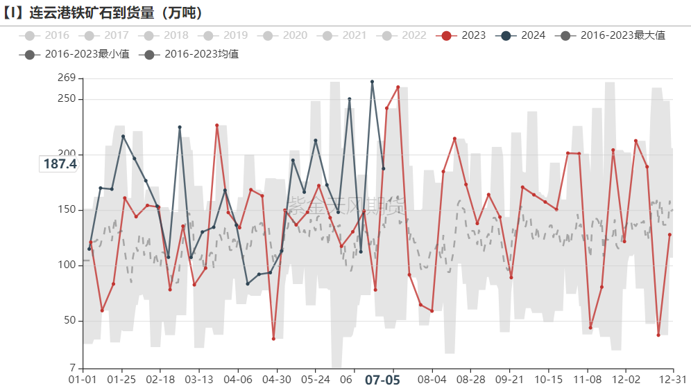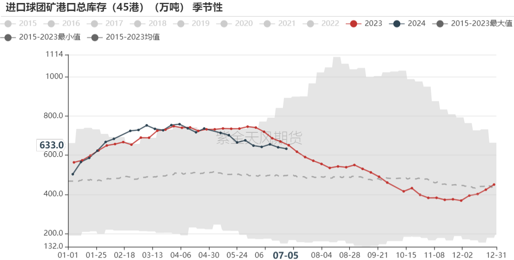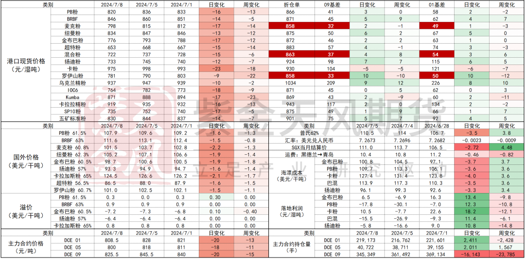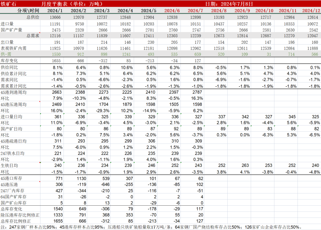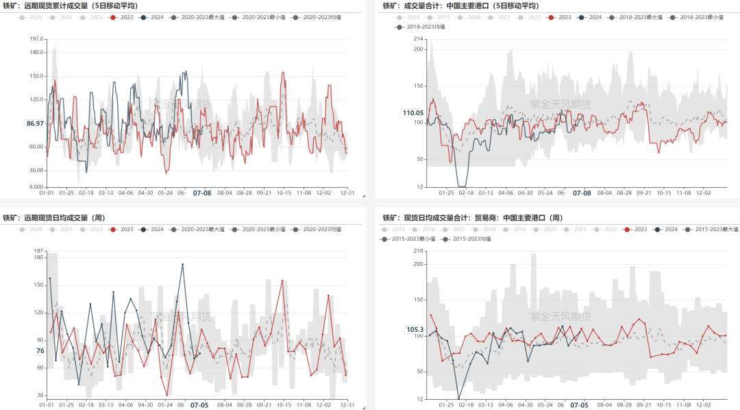 周度评述上周供应端发运总量下行;澳洲巴西上半年阶段冲量结束,非主流发运小幅下行。我国到港量小幅上行,处同期高位。需求端表现中性,247日均铁水-0.12万吨至239.32万吨,铁水阶段性见顶;247钢厂盈利率上行,原料震荡下行,卷螺利润环比持平。铁矿现货成交数据上行,钢厂利润下行情况下快粉价差有所收缩。库存端仍维持高库存状态,钢厂进口矿库存环比增73万吨;45港库存环比增62万吨。供应端将长期处于宽松状态;铁水阶段性见顶;成材及钢坯库存仍在累库阶段,终端需求未见明显好转。短期铁矿估值处合理区间内,上方高库存压力仍存,下方钢厂积极买货形成一定支撑。本轮铁水复产高度不及预期,终端需求韧性尚可,淡季无明显下滑,观点方面短期篇震荡,关注7月份重要会议的情况。