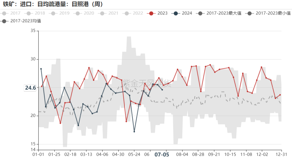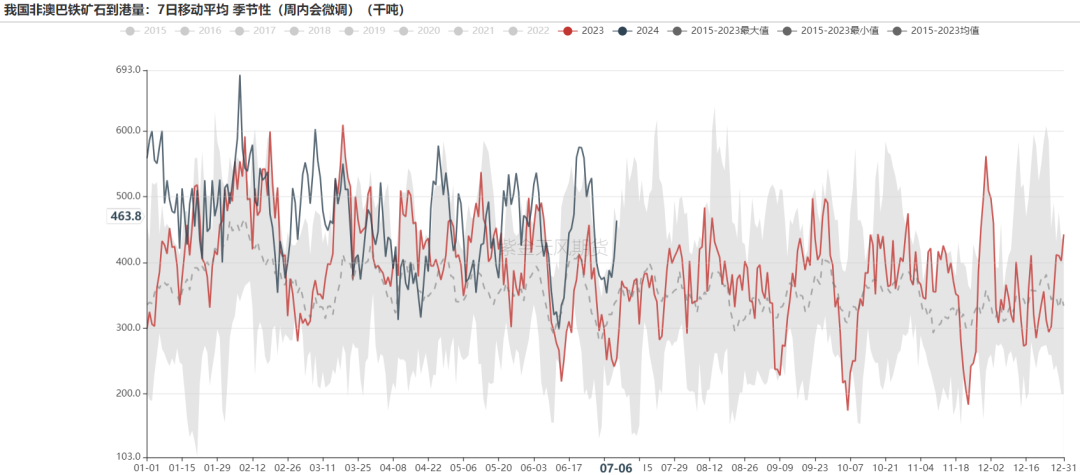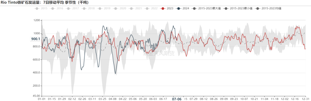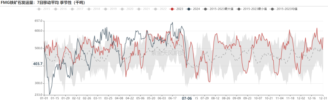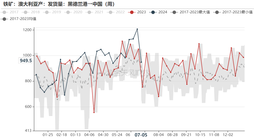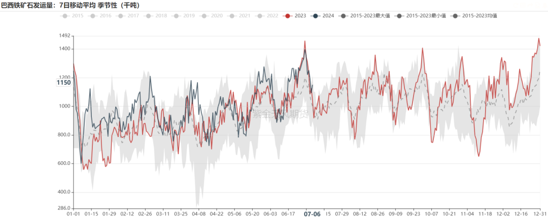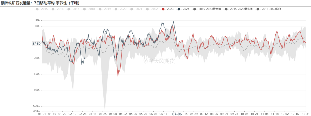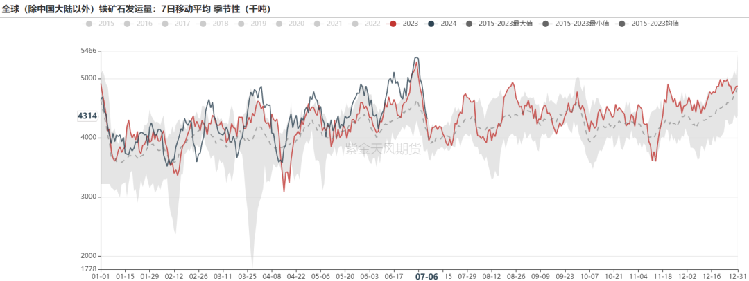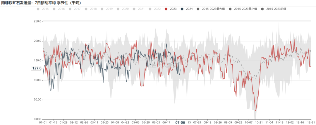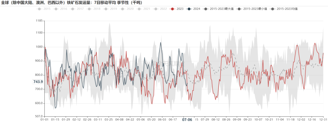 路透口径:2024年7月6日,路透全球铁矿7日移动平均发货量4314千吨,周环比减18.3%,同比增3.7%。澳洲7日移动平均发货量2420千吨,周环比减20%,同比持平;巴西7日移动平均发货量1348千吨,周环比减14.7%,同比增10.3%。