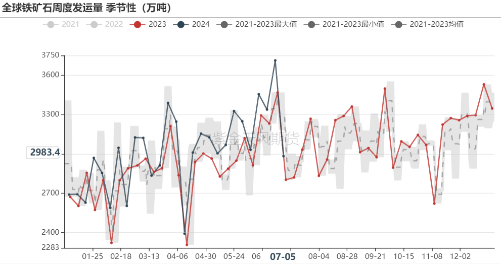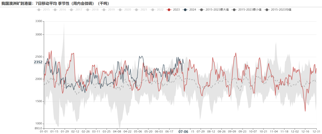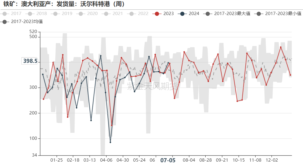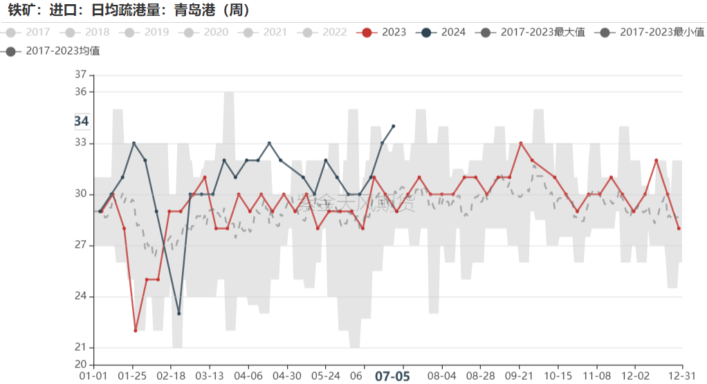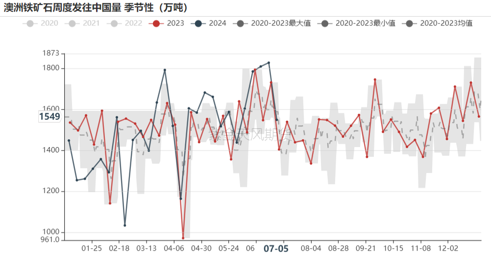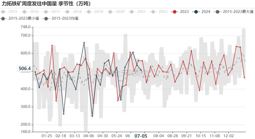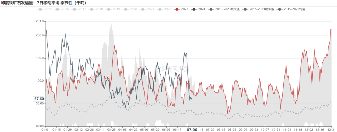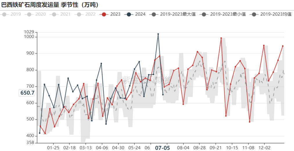 路透口径:2024年7月6日,路透全球铁矿7日移动平均发货量4314千吨,周环比减18.3%,同比增3.7%。澳洲7日移动平均发货量2420千吨,周环比减20%,同比持平;巴西7日移动平均发货量1348千吨,周环比减14.7%,同比增10.3%。