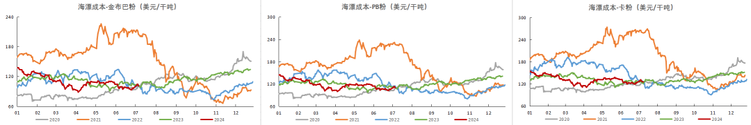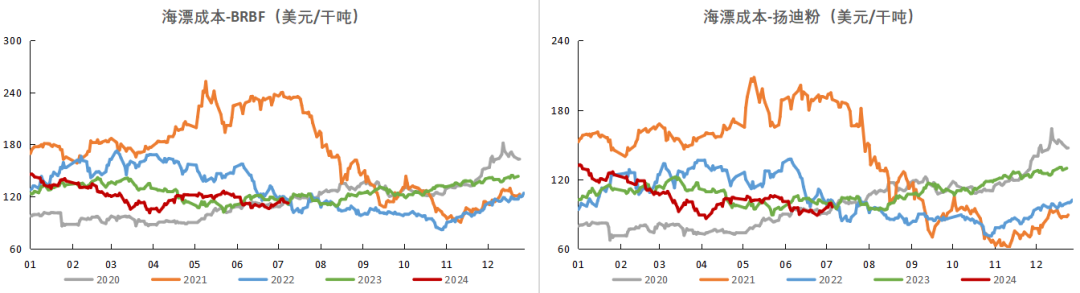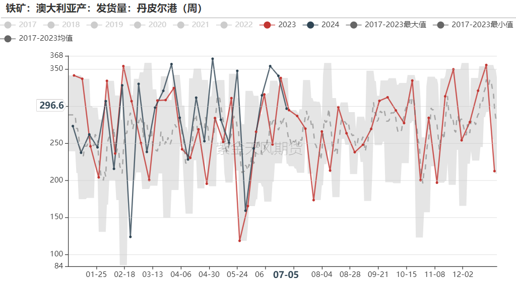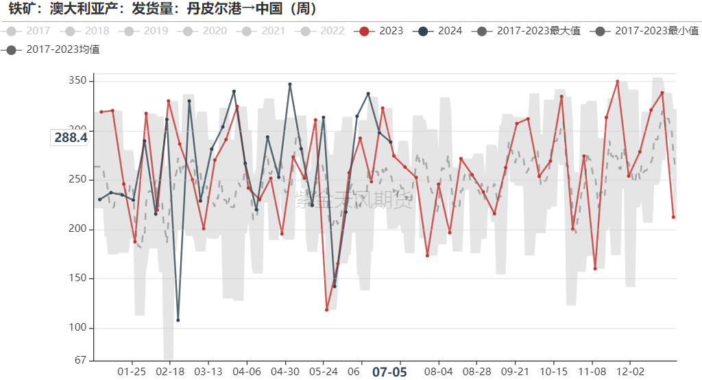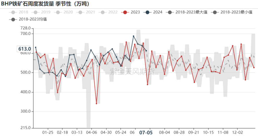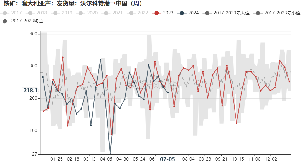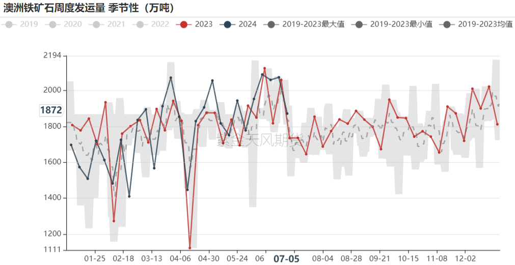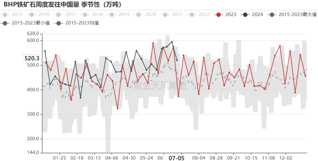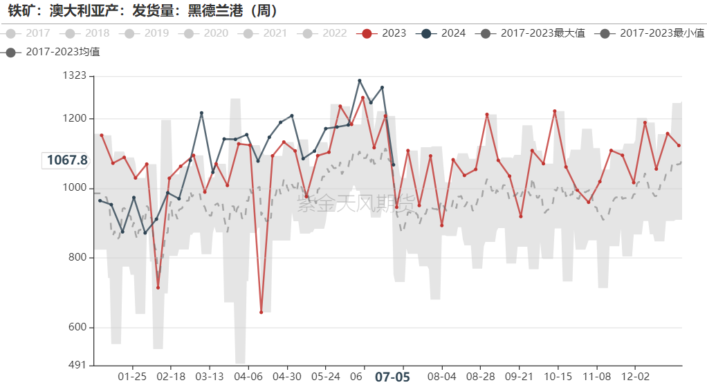 路透口径:2024年7月6日,路透全球铁矿7日移动平均发货量4314千吨,周环比减18.3%,同比增3.7%。澳洲7日移动平均发货量2420千吨,周环比减20%,同比持平;巴西7日移动平均发货量1348千吨,周环比减14.7%,同比增10.3%。