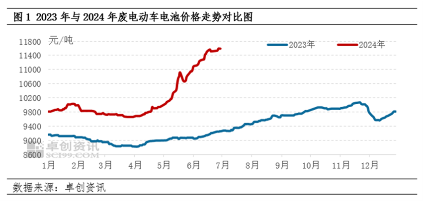 二季度废电瓶价格持续上涨,连破历史新高。据卓创资讯统计数据显示,截至6月28日,全国废电动车电池到厂含税价格为11500-11680元/吨,均价11590元/吨;较一季度末累计上涨1920元/吨,涨幅19.86%。本季度废电瓶价格最高点出现在6月底,全国废电动车电池含税到厂主流均价11590元/吨;最低点出现在4月初,全国废电动车电池含税到厂主流均价9695元/吨。本季度全国废电动车电池到厂含税均价为10578.75元/吨,环比今年一季度均价涨760元/吨,涨幅7.74%;同比去年二季度均价涨1532元/吨,涨幅16.93%。近两年废电瓶价格走势如图1所示。
