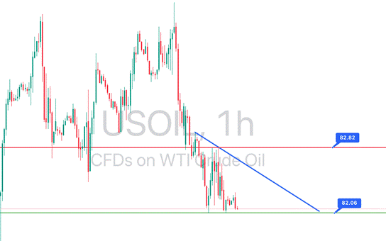 从技术角度看,原油交投处于短期看跌市场结构,形成较低的低点和较低的高点。目前位于82.06的支撑位是油价的关键观察位,此前曾两次阻止油价下跌。理解这些层次的重要性可以帮助你做出明智的投资决策。如果油价跌破82.06的支撑位,它可能会寻求更低的价格和下一个支撑位。82.82阻力位对油价来说仍然至关重要;如果油价仍低于这一水平,则维持看跌。如果油价成功突破82.82阻力位,它可能会从看跌转为看涨,并朝着下一个阻力位前进。