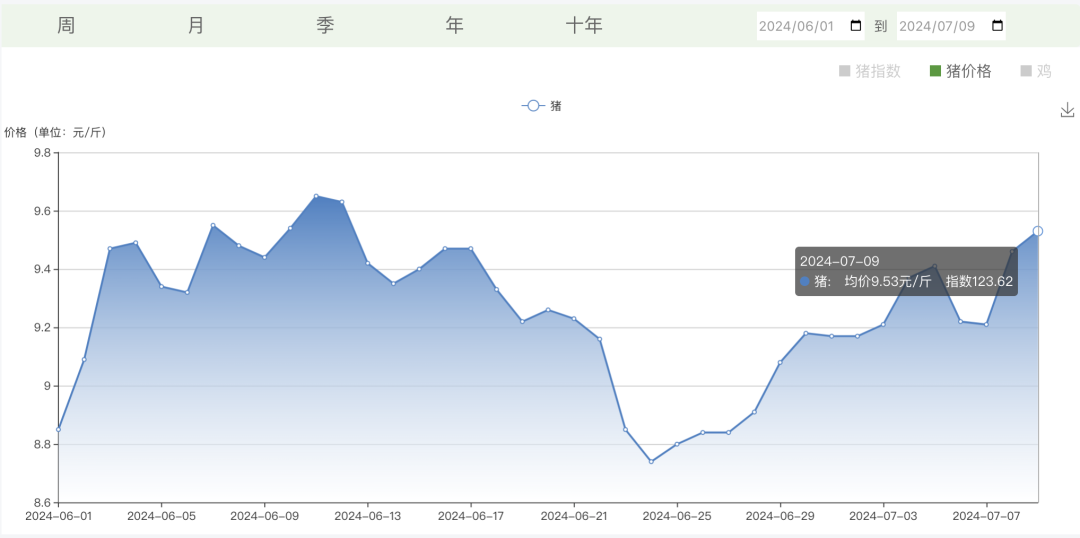 据新牧网监测的生猪报价信息统计,2024年7月9日新牧猪价指数123.62,较昨日上调0.94点。今日全国生猪均价为9.53元/斤,较昨日上调0.07元/斤。较上周同期上调0.36元/斤,上调幅度3.92%。