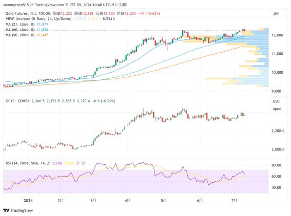 东京市场方面,虽然美元兑日元汇率保持160日元一线支撑,但由于NY黄金价格的回落至,导致东京主力合约来到12200日元一线水平收盘。