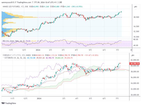 昨天的东京证券市场,在前一天创下新高后获利了结的压力下,日经平均指数小幅回落至40700日元一线收盘。上周末的美股市场上由于,美国6月份就业统计显示劳动市场供需缓和,增强了美联储年内降息的预期。由于日经平均指数上周大幅上涨超过1300日元,东京市场早盘在高位开盘后便遭遇较强的获利了结压力。另一方面,有市场分析显示本周伴随ETF分红将有数千亿日元规模的空单压力,结合股指期货市场上的调整交易,尾盘小幅收低。进入欧美交易时间,在美联储主席鲍威尔出席国会听证以及美国6月份消费者物价指数公布之前,市场上呈现出以持仓调整为主的抛售压力。NY道琼斯指数上周末小幅收低在39300美元一线。另一方面,高科技股依旧保持强势,纳斯达克综合指数连续创下新高。受此影响,日经指数期货晚盘回到40900日元的近期高位收盘。