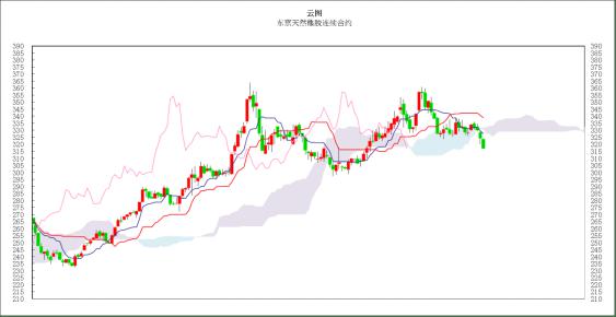 技术方面来看,东京橡胶突破325-335日元区间的下限后,呈现较强的下行趋势。一目均衡表上来看,价格实体下跌至中期基准线以下水平,同时也向下穿过云层也显示较强的做空信号。交易策略上建议逢高抛空。