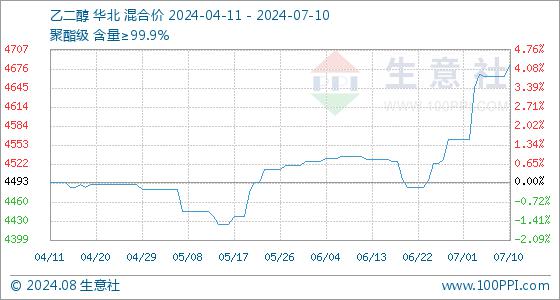 7月10日,生意社乙二醇基准价为4665.00元/吨,与本月初(4561.67元/吨)相比,上涨了2.27%。