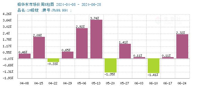 商品价格K柱图,运用价格走势K线的理念,以柱状图形式,反映每周或者每月的价格涨跌变化,投资者可以根据K柱图的变化,来进行买卖投资。红色表示:上涨;绿色表示:下跌;K柱高度表示:涨跌幅度。2024年铅锭价格多数上行,除了2月跌1.77%外,其他月份涨幅均在2.8%以上。周度K柱图来看近期市场涨多跌少。
