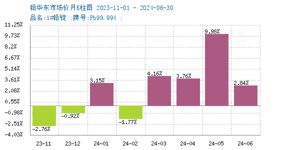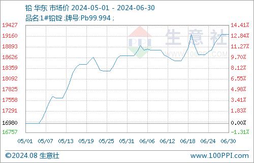 据生意社商品行情分析系统:2024年6月国内1#铅锭市场震荡上涨,国内市场均价月初在18675元/吨,月末19205元/吨,月涨2.84%。