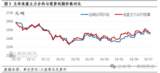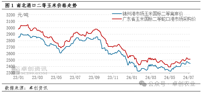 7月供应端心态发生些许变化,东北产区因华北玉米价格优势持续外发受阻,区域内消化有限,部分贸易商挺价心态有所松动,适价出货,高位价格有所回落,但成本因素对底部价格依旧有较为明显的支撑。截至7月8日,东北产区玉米均价为2400元/吨,相比6月底下跌7.5元/吨,跌幅0.32%。另外,国内连盘期货在7月上旬也呈现偏弱走势,截至7月8日收盘,连盘主力09合约结算价为2465元/吨,相比6月底下跌55元/吨,直接影响作为交割地的北方港口贸易心态,也是得北港价格在7月初呈现偏弱走势。