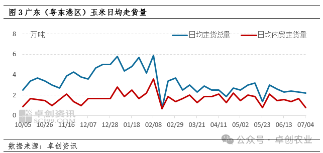7月初需求端采购心态也有些许变动,从港口走货量数据来看,下游企业采购积极性下降,内贸玉米走货量持续缩减。下游企业表示,目前替代品种类多样,总体供应宽裕,并且规模性替代品小麦的价格短期内预期涨幅有限,有意提高小麦加工替代比例,对内贸玉米消费形成利空影响。