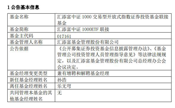 汇添富中证1000ETF联接增聘基金经理孙浩乐无穹离任