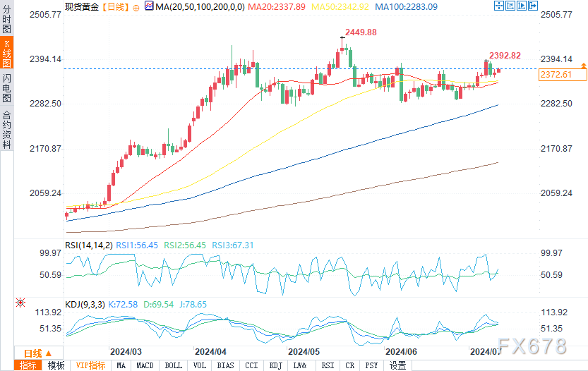 现货黄金日线图上,除了周一出现大逆转之外,本周值得注意的是黄金价格在下跌至2350美元以下时得到了多大程度的支撑。也许价格会跌至50日移动均线2343.08美元,但在今天之前的四个交易日中,价格都从2350水平反弹。